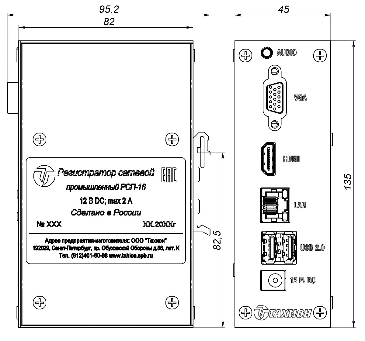 Конструктивно регистратор РСП-16 выполнен в компактном металлическом корпусе для установки на DIN-рейку в шкаф или на стену.